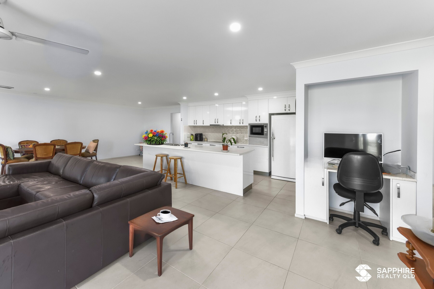 Complementing the bedroom layout is a large family room, a separate activity lounge, and an expansive open‑plan kitchen, dining, and living area that forms the social heart of the home. The kitchen offers excellent bench space, an island‑style layout, and smooth connection to the living zones-ideal for entertaining or hosting Airbnb guests. An enclosed alfresco area provides year‑round outdoor living and captures refreshing coastal breezes. Completing the property is a large 3‑bay lockable garage, offering secure parking, generous storage, and workshop potential.