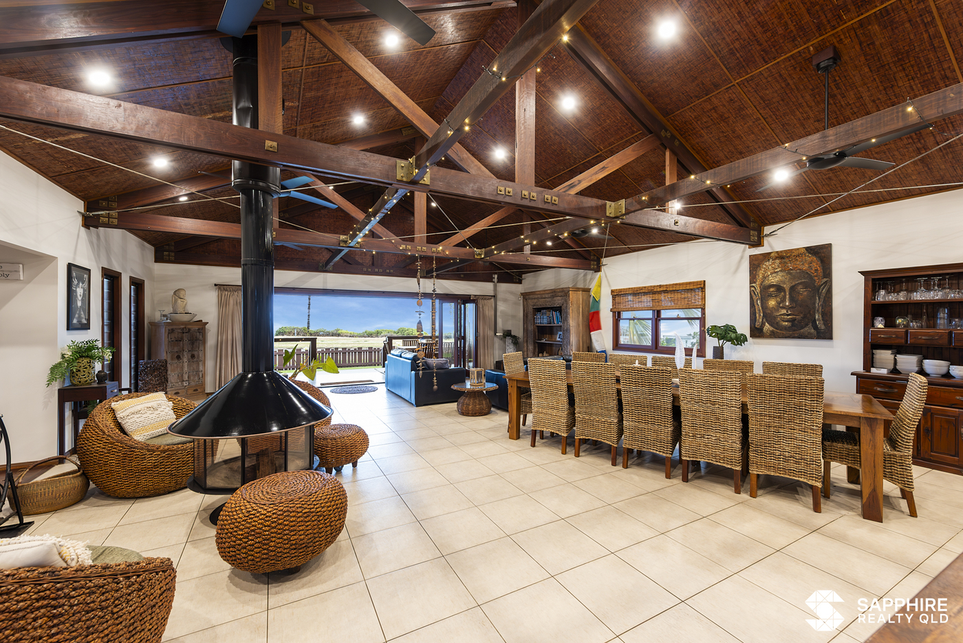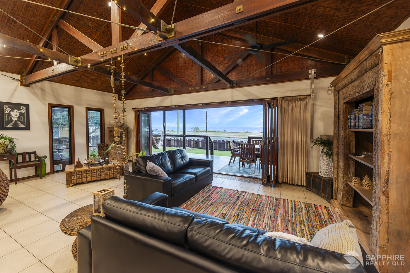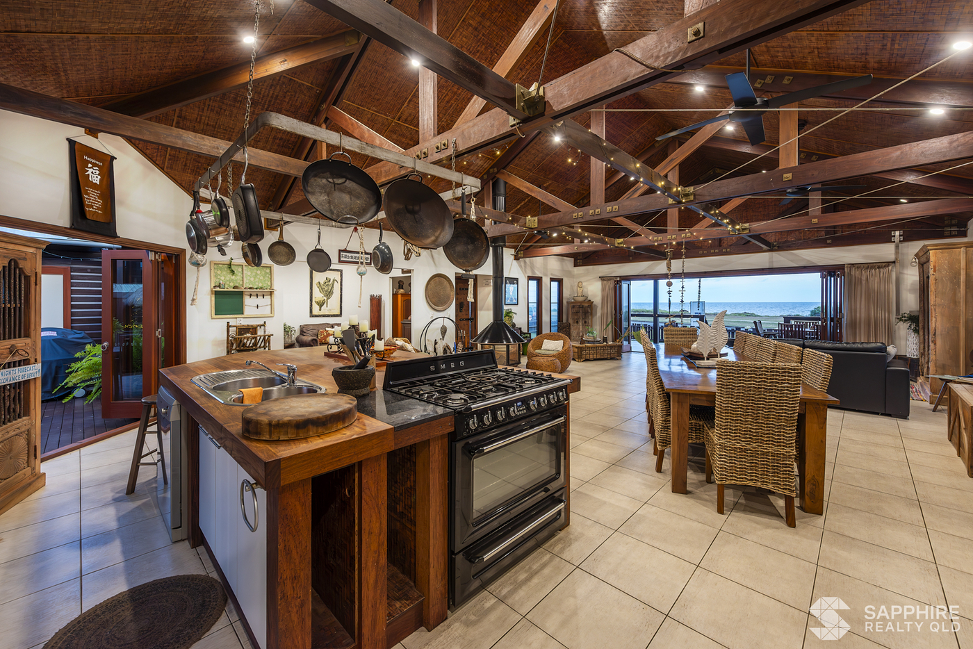 Imagine waking up to uninterrupted, panoramic views of the Coral Sea-this is the lifestyle offered at 109 Sea Esplanade. With no obstacles between you and the horizon, every sunrise and sunset becomes a private show from the comfort of your home. Set on a rare double block of approximately 1,860m², this property is more than a home; it's a coastal sanctuary designed for relaxation, entertaining, and income potential. Featuring five bedrooms, two bathrooms, and two full kitchens, the layout is perfect for dual living or an Airbnb opportunity. Architecturally crafted ceilings enhance the sense of space, while the fireplace adds warmth and charm. The exterior's hardwood weatherboard finish adds a stylish, timeless appeal and a warm, welcoming feel that complements its coastal setting.