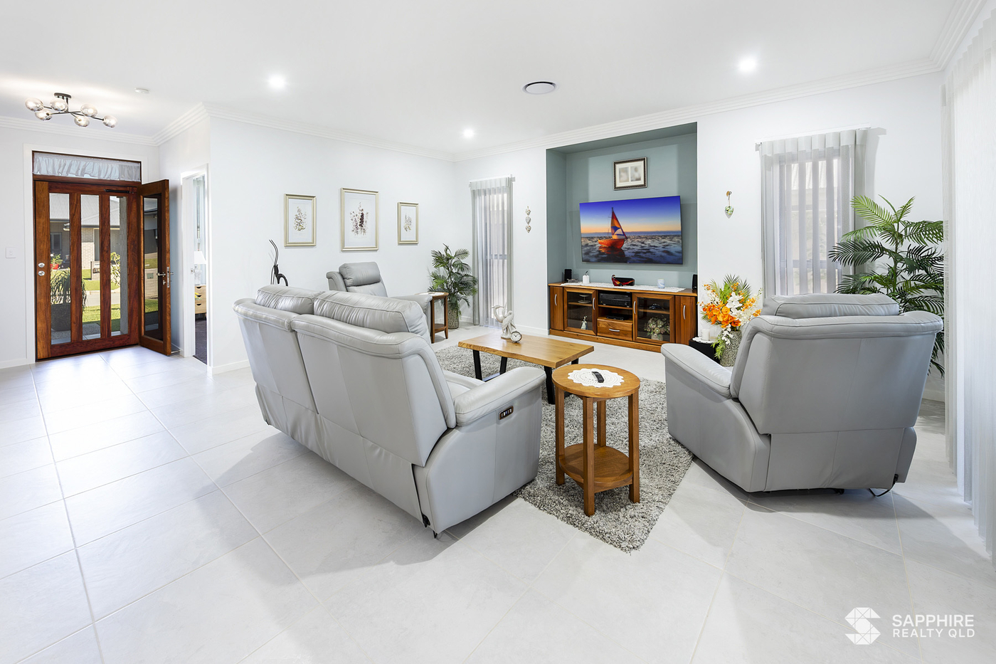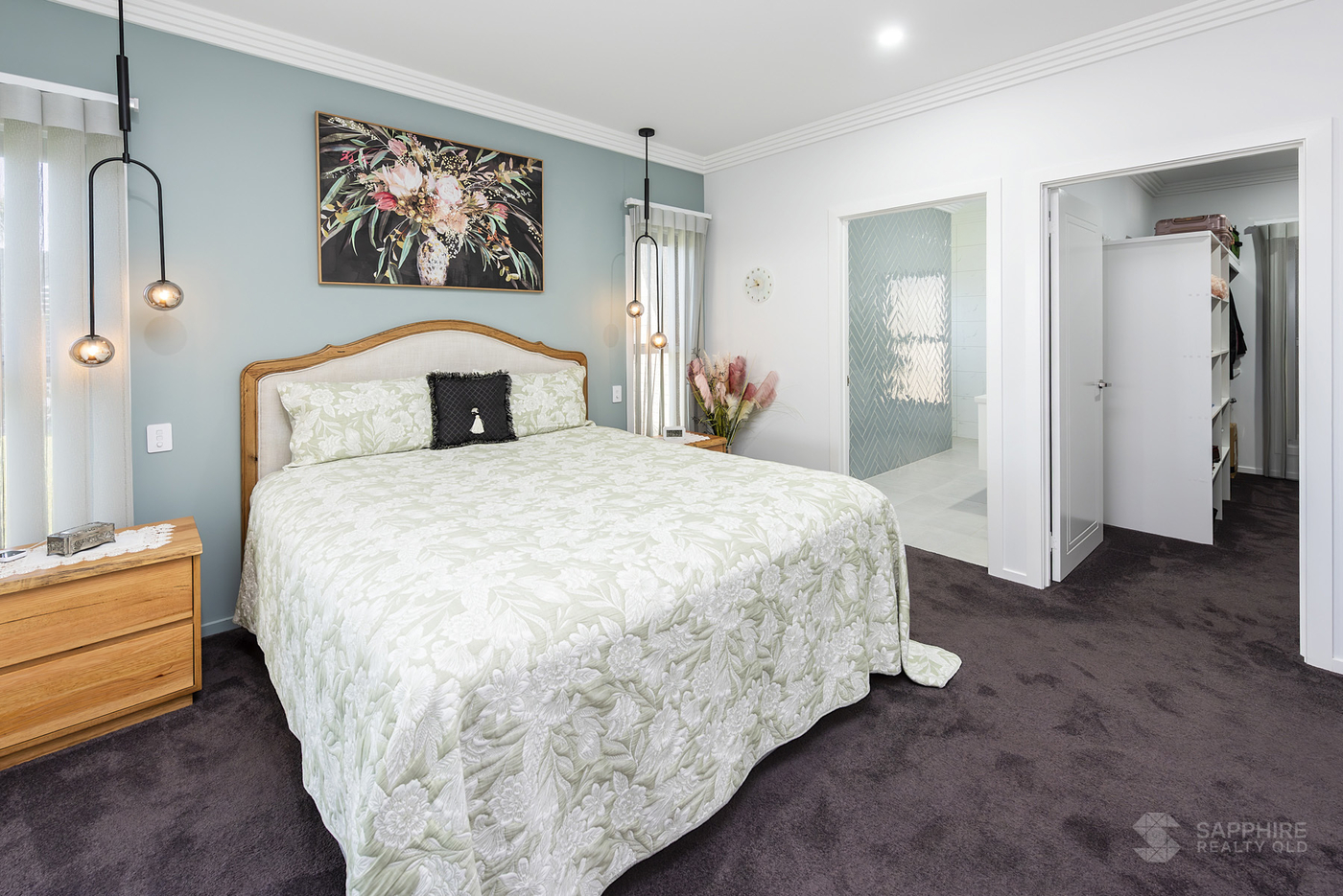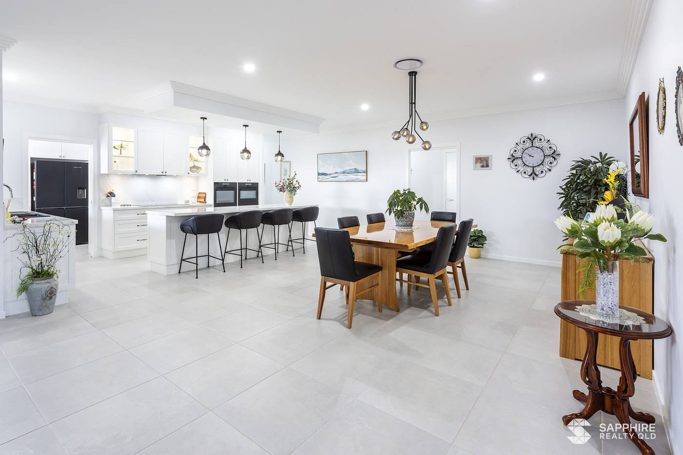 The master suite includes a spacious walk-in wardrobe, while additional features like a walk-in linen closet, open pantry, and triple water filtration system add both convenience and sophistication. VeriShade window dressings offer a soft, modern finish throughout, and the home is powered by an impressive 8.9kW solar system for energy efficiency.