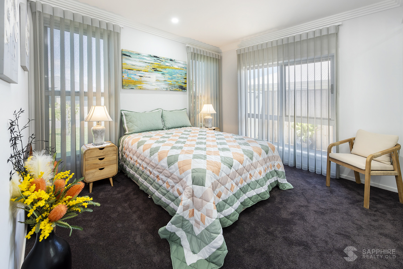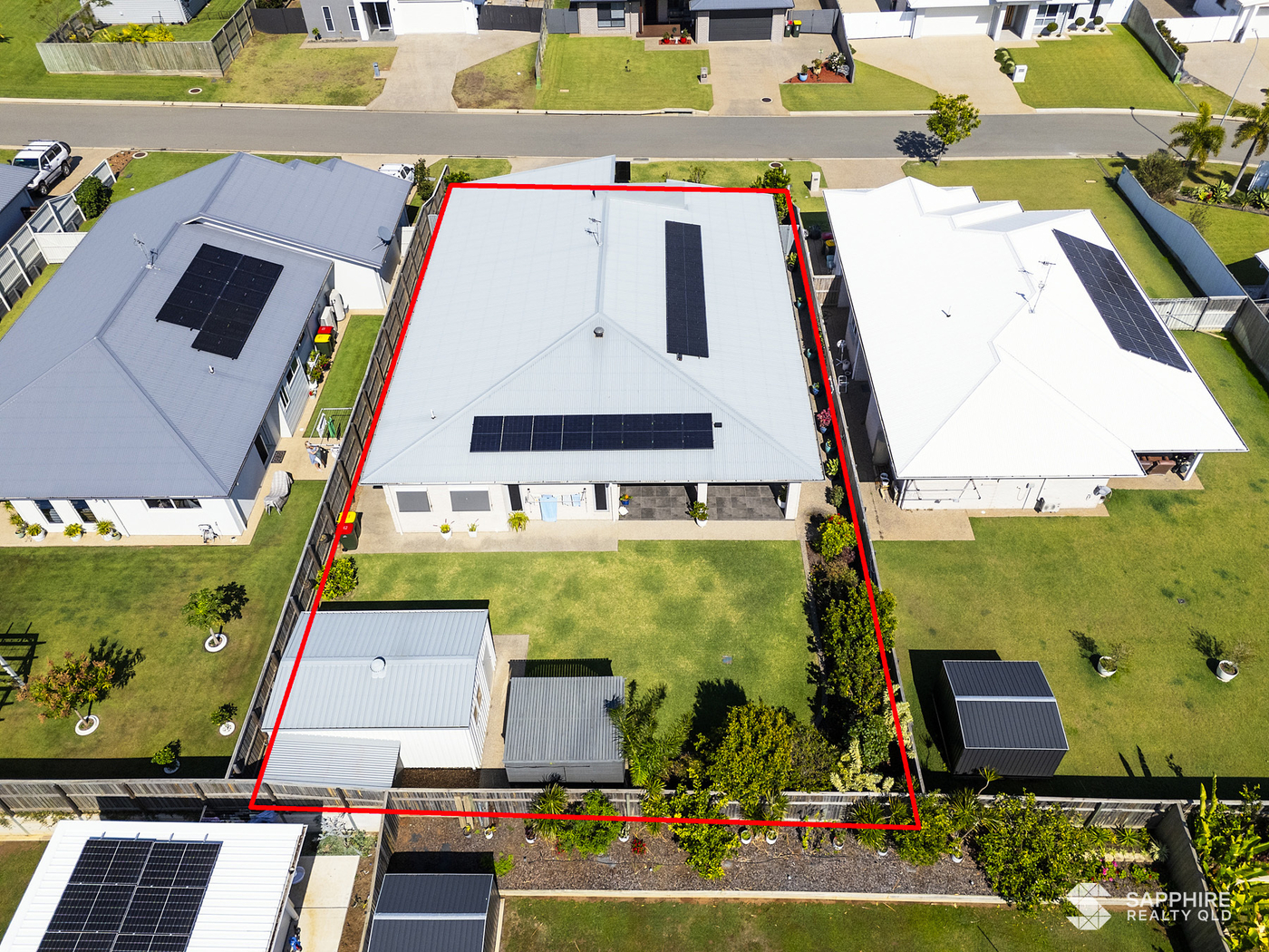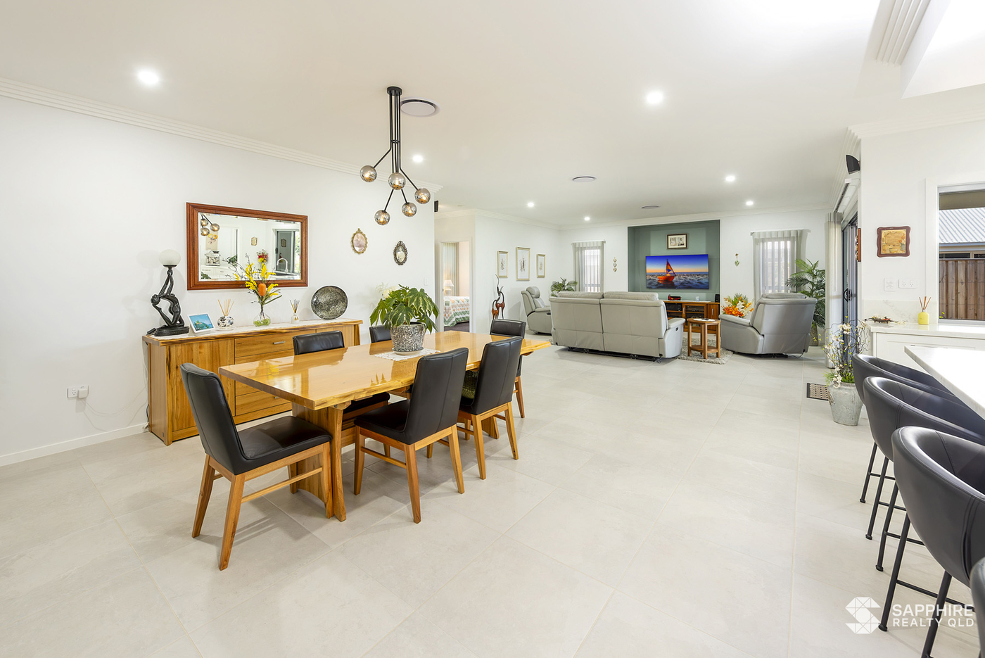 The master suite includes a spacious walk-in wardrobe, while additional features like a walk-in linen closet, open pantry, and triple water filtration system add both convenience and sophistication. VeriShade window dressings offer a soft, modern finish throughout, and the home is powered by an impressive 8.9kW solar system for energy efficiency.
